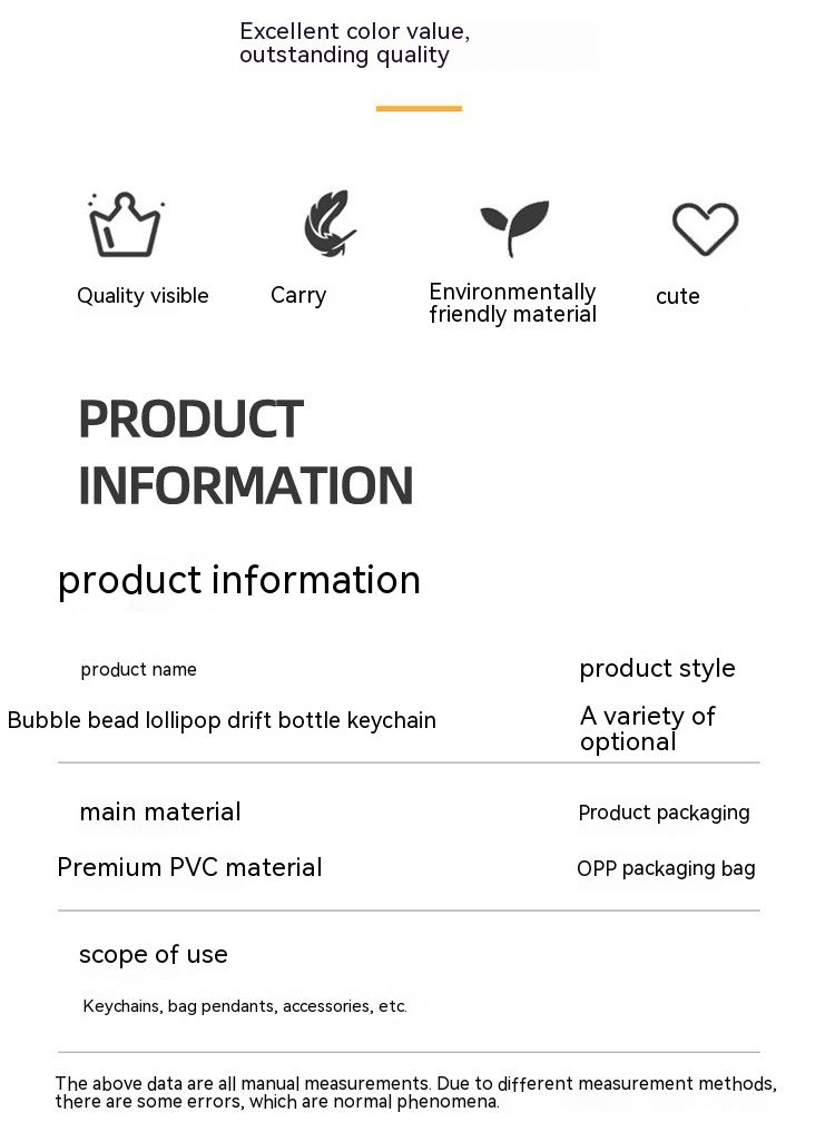 Ce porte-clés sucette à sable mouvant séduit par son design cartoon mignon et ses perles bulles colorées en mouvement. Un accessoire décoratif original, parfait pour personnaliser clés, sacs ou offrir en cadeau.